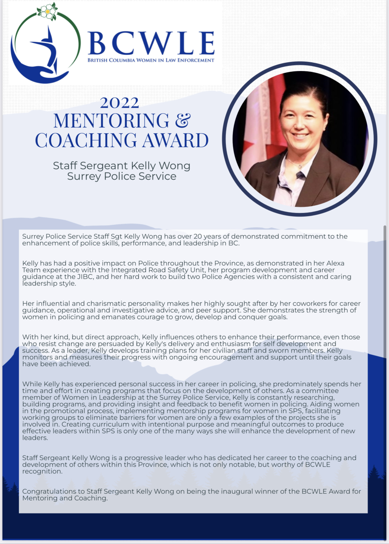 Staff Sgt. Wong was recognized as a female officer who distinguished herself by her support, assistance and development of women in law enforcement by focusing on their career aspirations, their on-going personal development, and by producing training programs and policies that enhance the role of women in policing. Staff Sgt. Wong is a police officer with more than 20 years of experience enhancing police skills, performance and leadership in British Columbia. Staff Sgt. Wong is a member of the SPS where she is leading the training unit. As SPS continues to grow, Staff Sgt. Wong’s efforts to develop and implement training programs and opportunities are shaping the future of the SPS as well as the careers of the officers working within the organization. Staff Sgt. Wong is known for focusing her efforts on mentoring her peers and helping women to succeed and achieve their career goals. Click here to learn more about Staff Sgt. Wong, winner of the 2022 BCWLE Mentoring & Coaching Award.